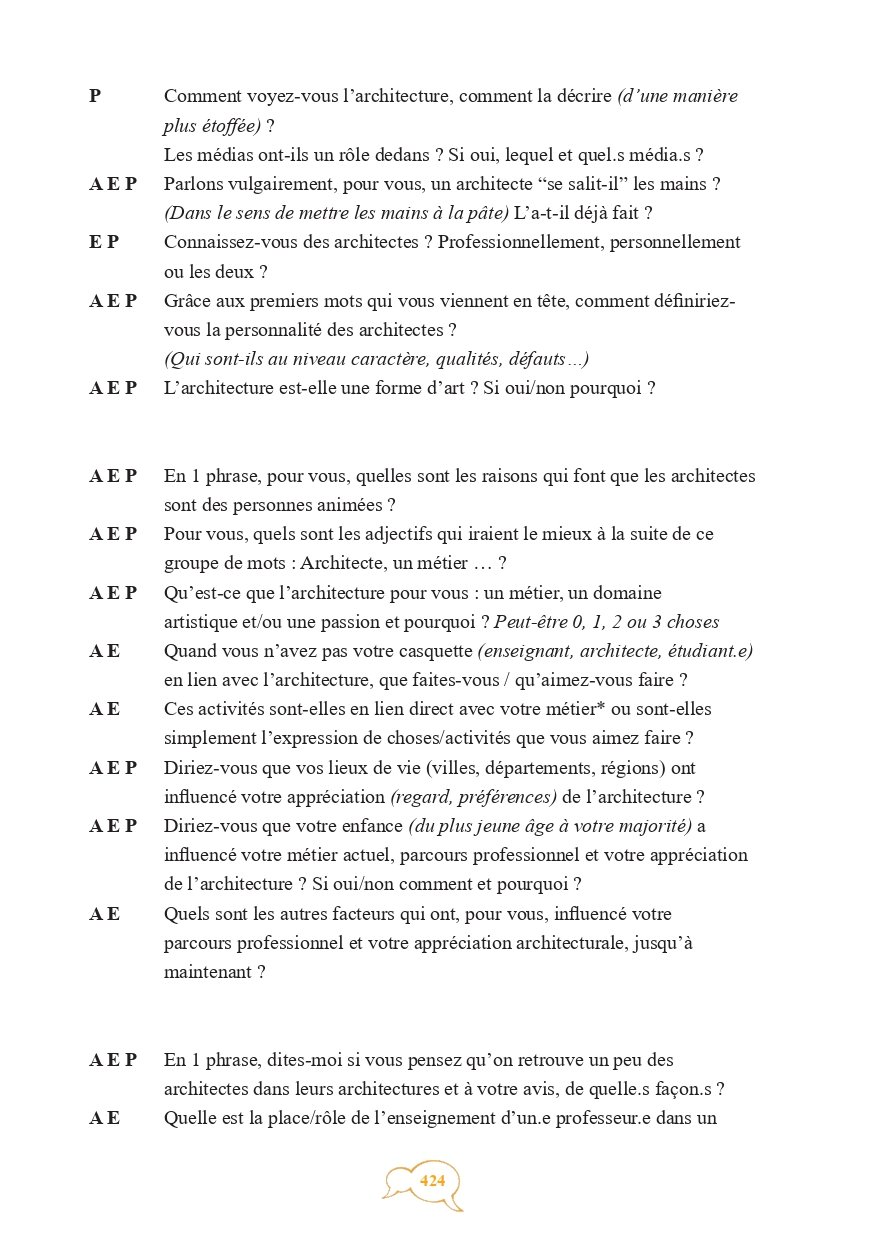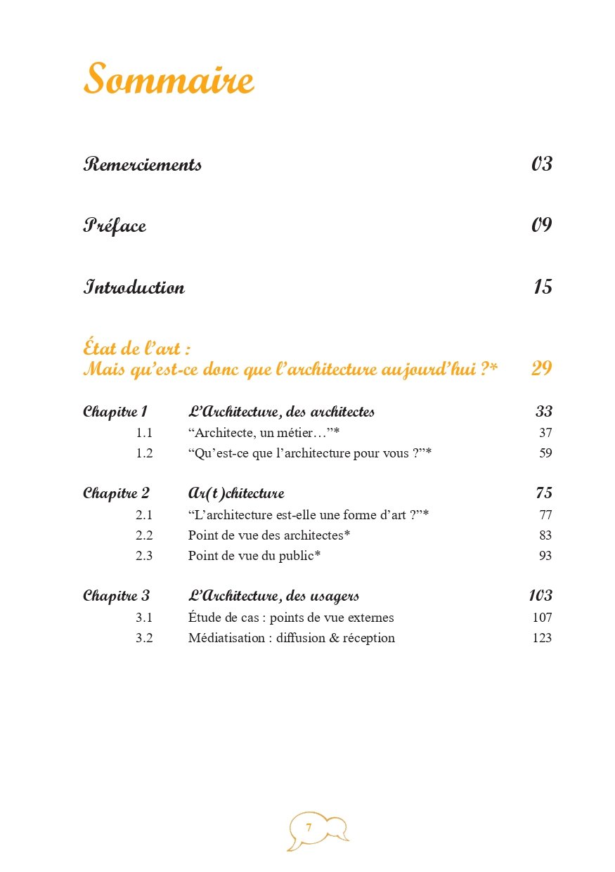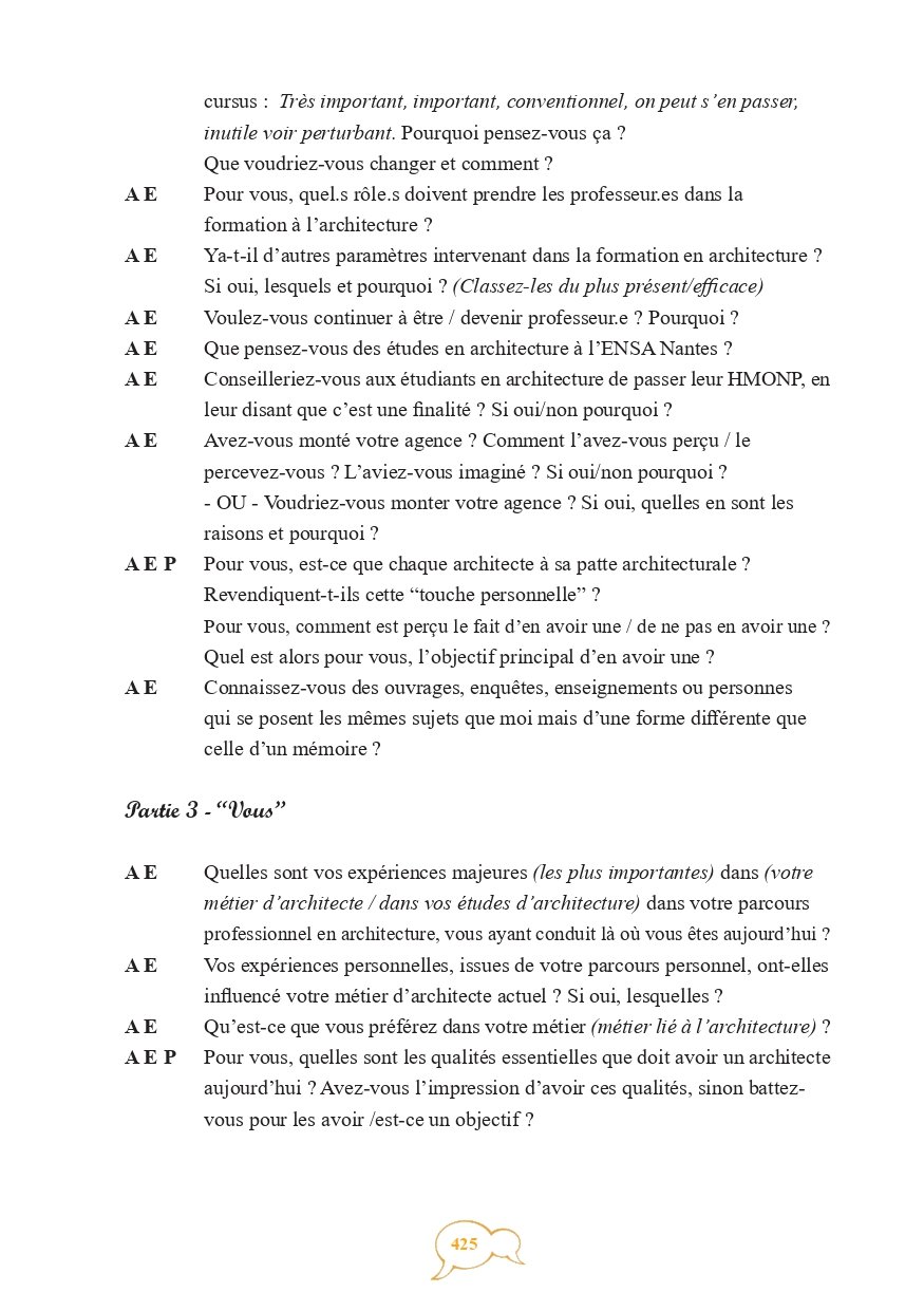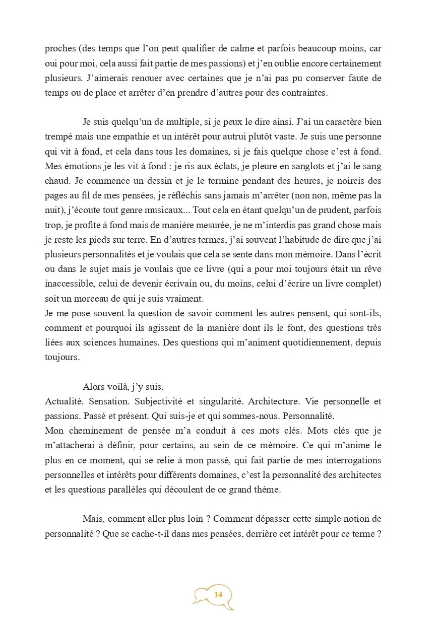 Cette recherche emporte trois objectifs principaux : montrer pourquoi et par quoi les architectes sont des personnes animées aussi bien intrinsèquement que par leur métier, soulever la partie submergée de l’iceberg concernant la notion de patte architecturale et démont(r)er la qualification en métier passion de la profession d’architecte.”