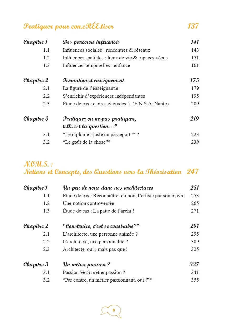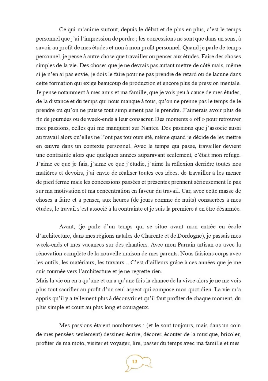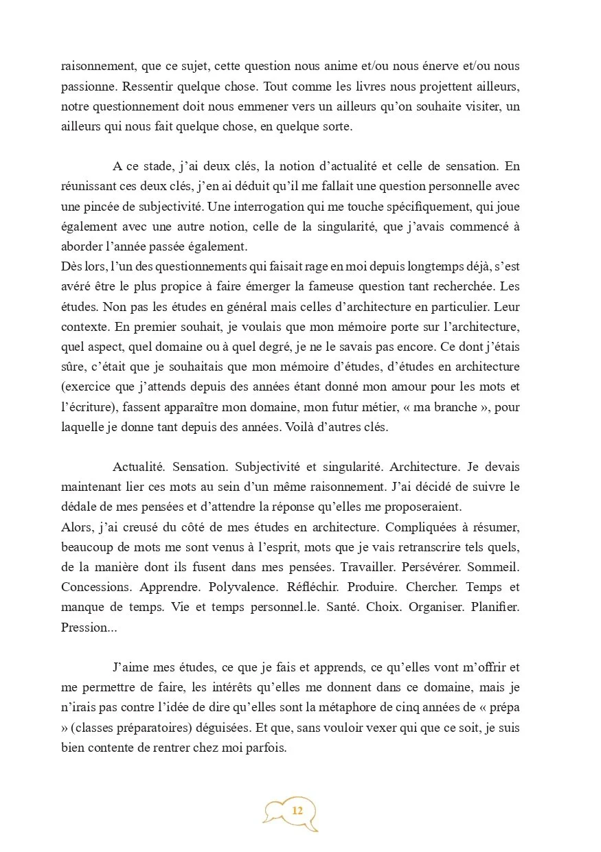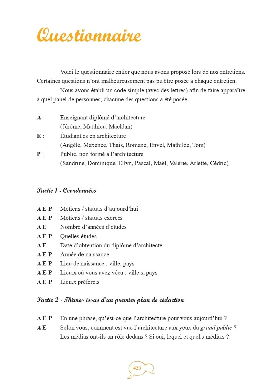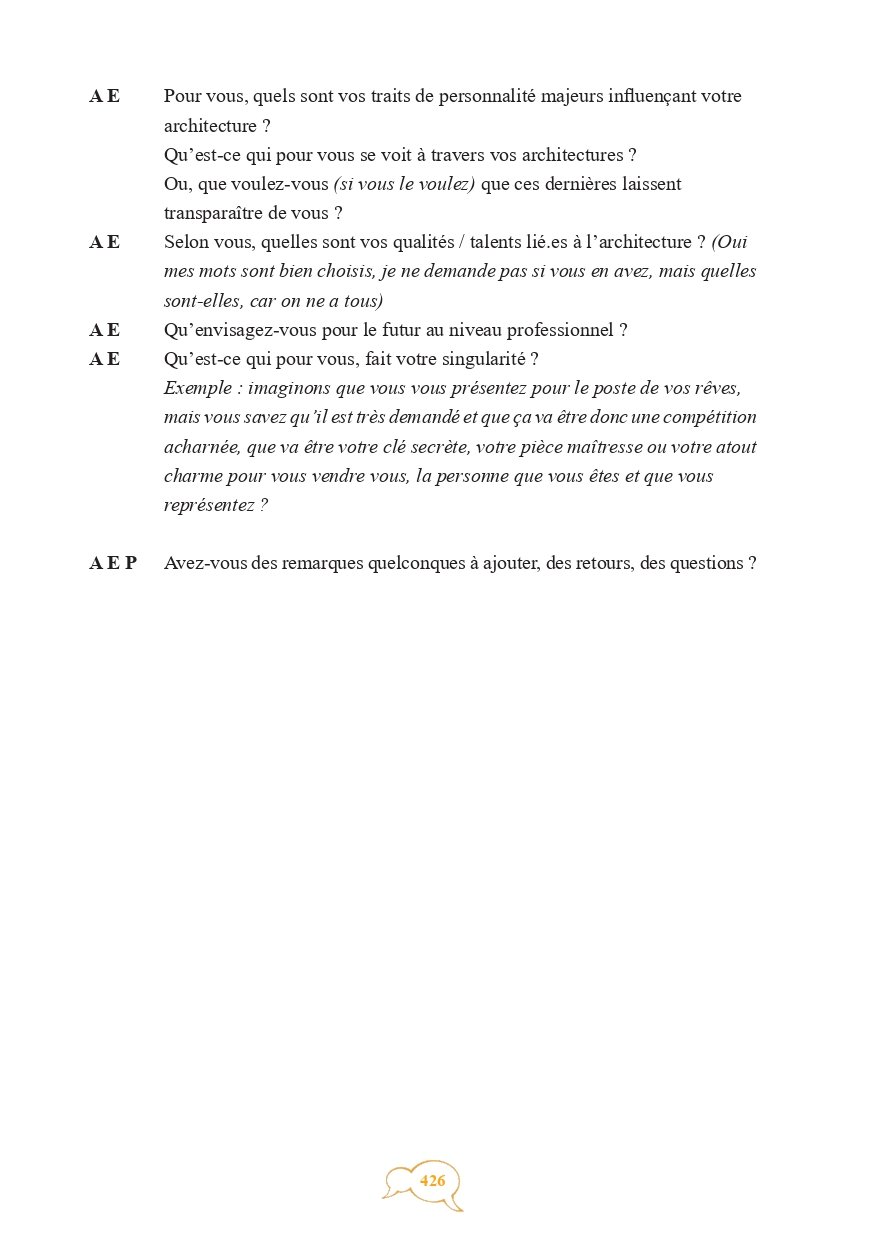 Cette recherche emporte trois objectifs principaux : montrer pourquoi et par quoi les architectes sont des personnes animées aussi bien intrinsèquement que par leur métier, soulever la partie submergée de l’iceberg concernant la notion de patte architecturale et démont(r)er la qualification en métier passion de la profession d’architecte.”